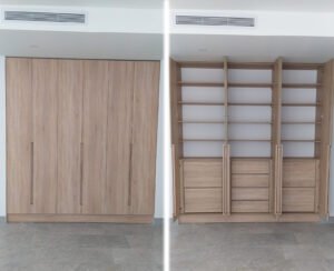 Este mueble está diseñado para habitaciones modernas y funcionales, combinando almacenamiento con una superficie útil que puede funcionar como escritorio, tocador o estación de trabajo. Superficie de trabajo alargada en acabado de madera tipo nogal o encino, ideal para trabajar, estudiar o colocar objetos decorativos. Cajonera lateral con acabado en tono gris mate, que proporciona almacenamiento organizado. Paneles verticales y entrepaños abiertos para libros, dispositivos o elementos decorativos. Diseño empotrado y minimalista, adaptado al espacio de la habitación, aprovechando el muro para dar continuidad y fluidez visual. Este mueble aporta funcionalidad sin perder estética, ideal para quienes buscan integrar una zona de trabajo en su recámara sin romper con el diseño interior.